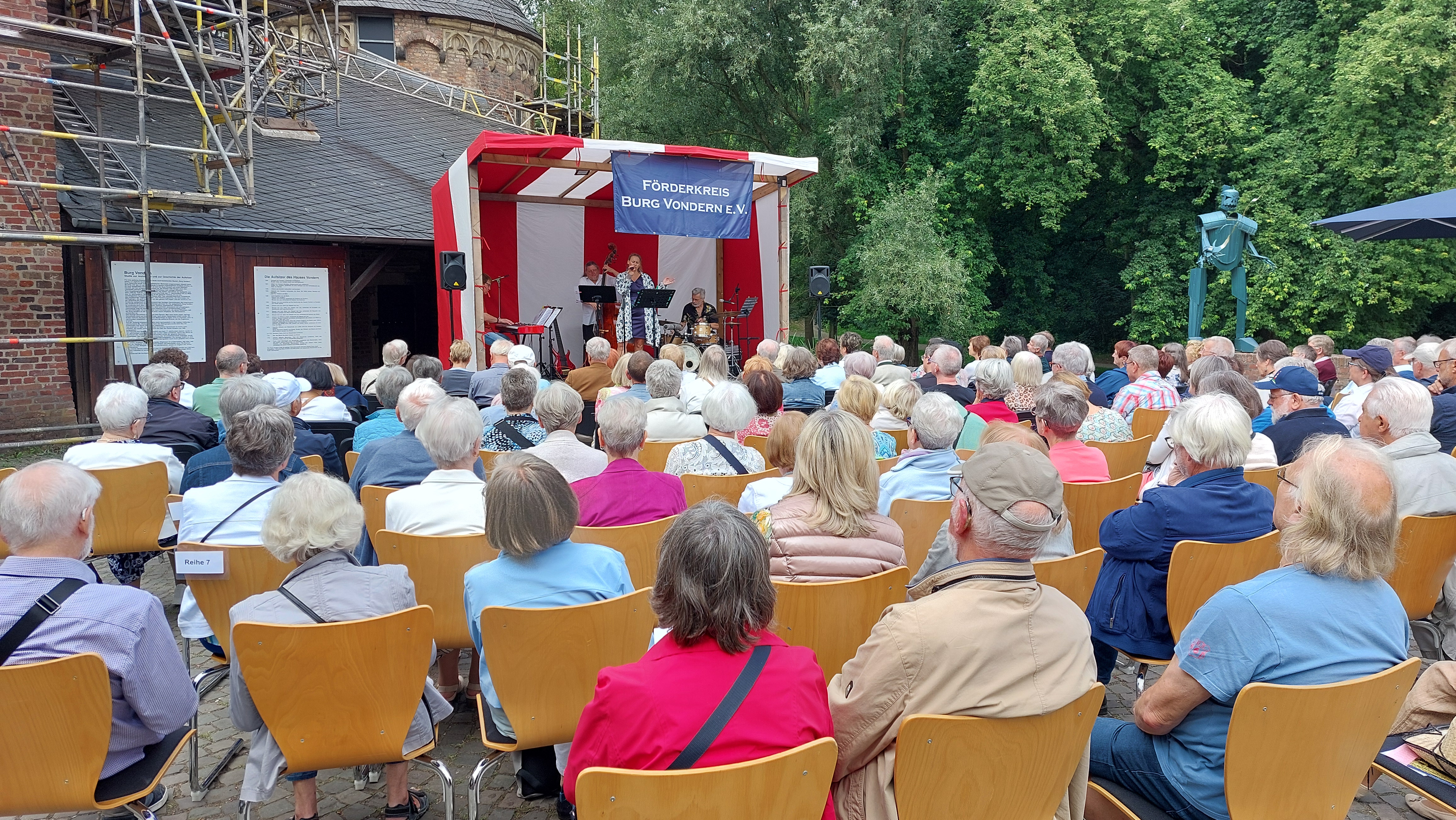 Das zeigte sich in der Matinee des Förderkreises Burg Vondern e.V. auch am 17. August 2025, bei der sich der Burghof der Burg Vondern mit einem interessierten Publikum gefüllt hatte. Es spielte das Quartett Magic Moments in der Besetzung, Rolf von Ameln - Klavier, Urs Wihager-Dietz – Drums und Uli Schmidt – Schlagzeug. Sie bildeten den Klangteppich, auf dem sich die Sängerin Bianca Mey entfalten konnte. Alles in allem ein farbiges, stilistisch überzeugendes Programm, das von einfallsreichen Improvariationen geprägt war.